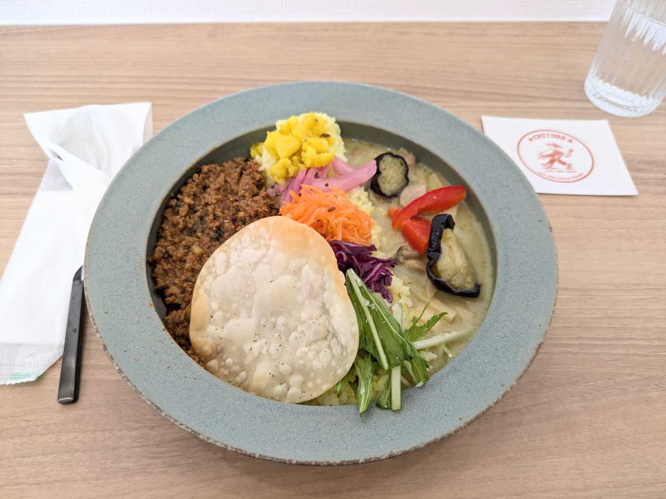 グリーンカレーと味噌キーマカレーの2種かけをいただきました。やーとってもおいしい!