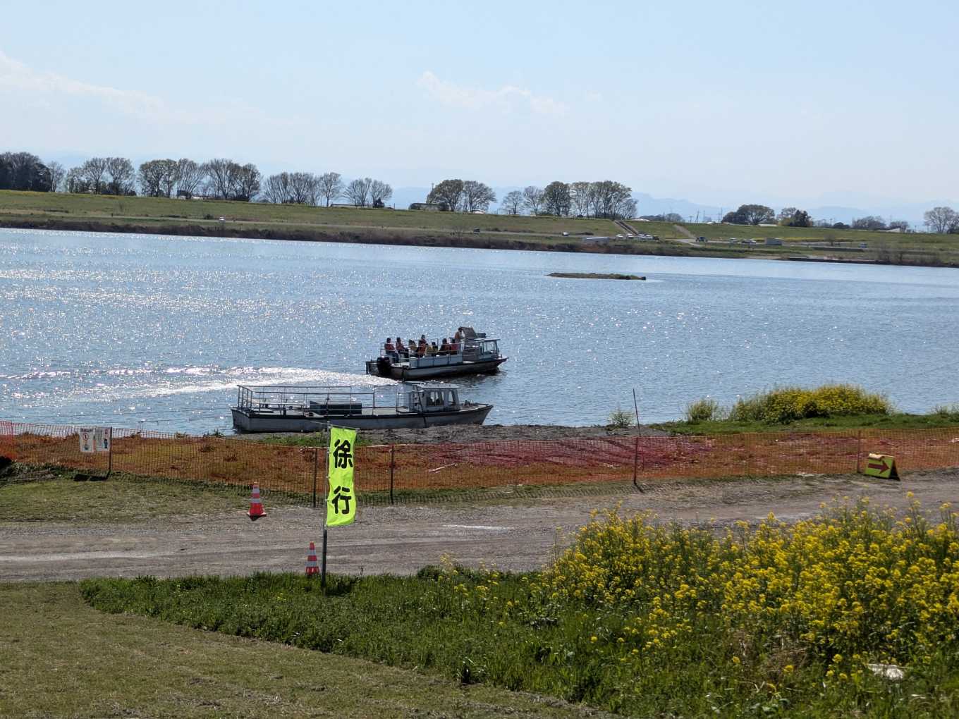 赤岩渡船場側の土手の上から見たところ。矢印のところが『赤岩ベース』です。