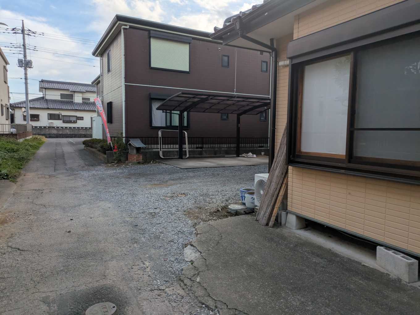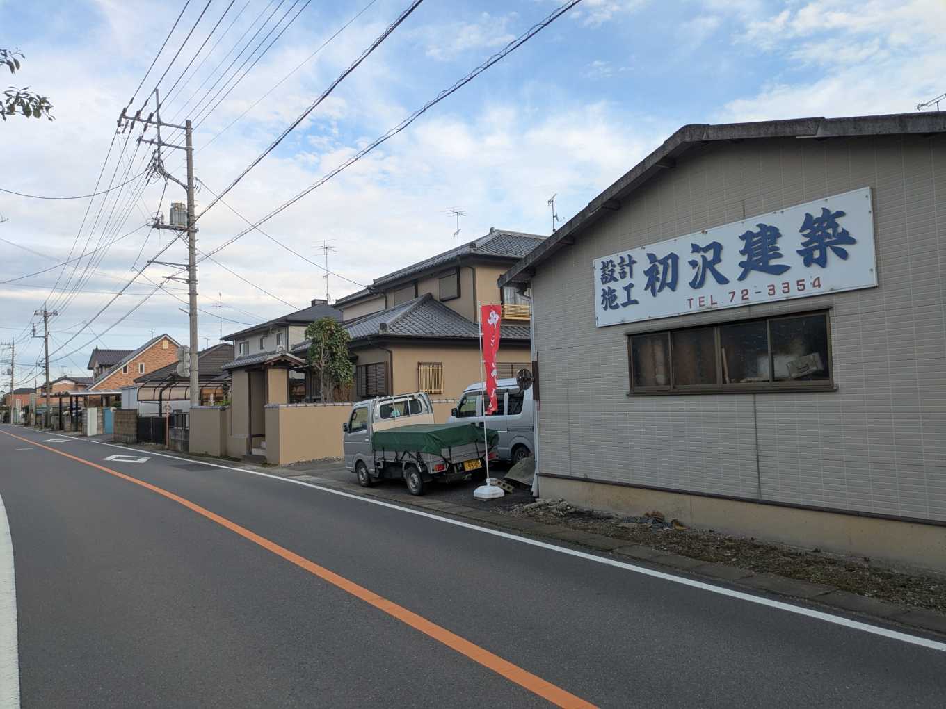 右手に初沢建築の看板が見えたところに「焼きそば」の赤いノボリがありました。ここを右折します。
