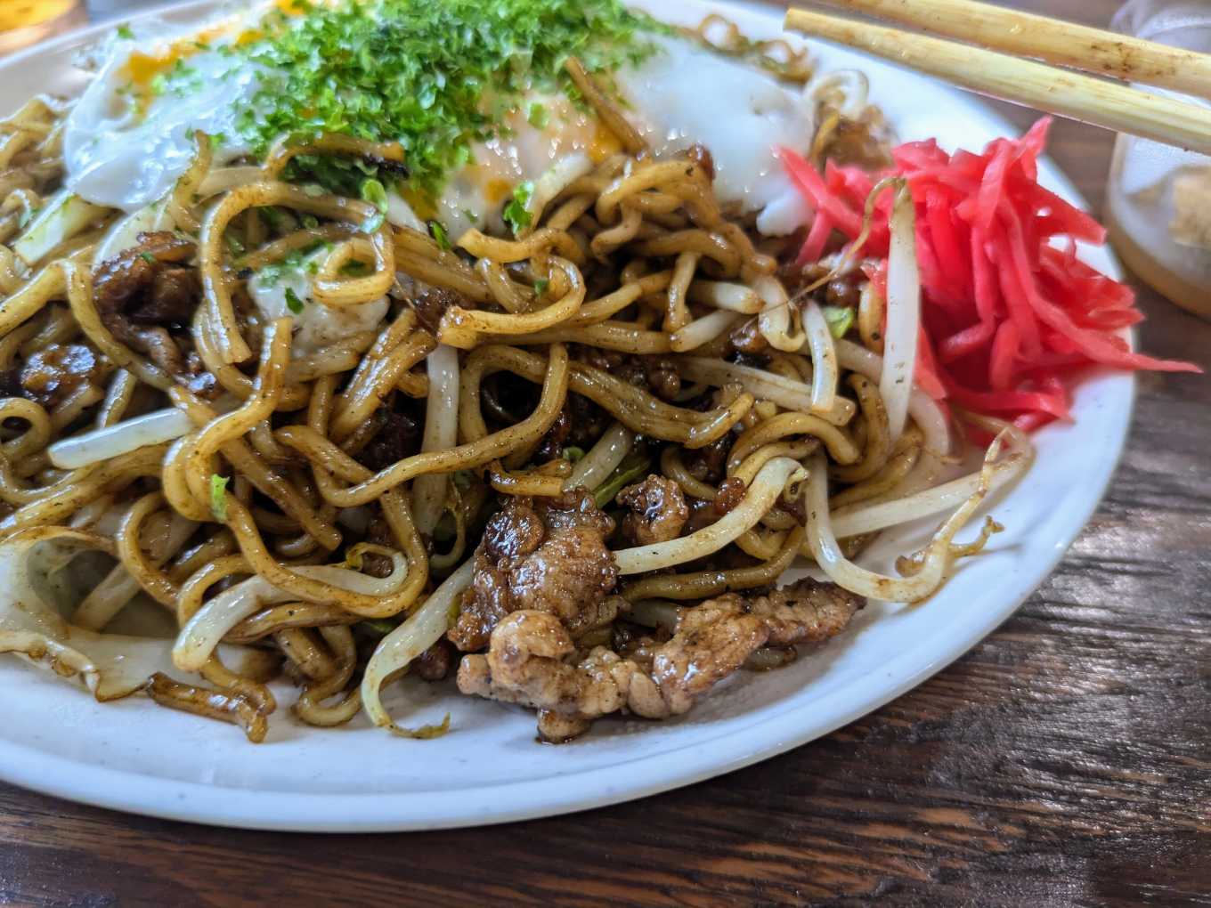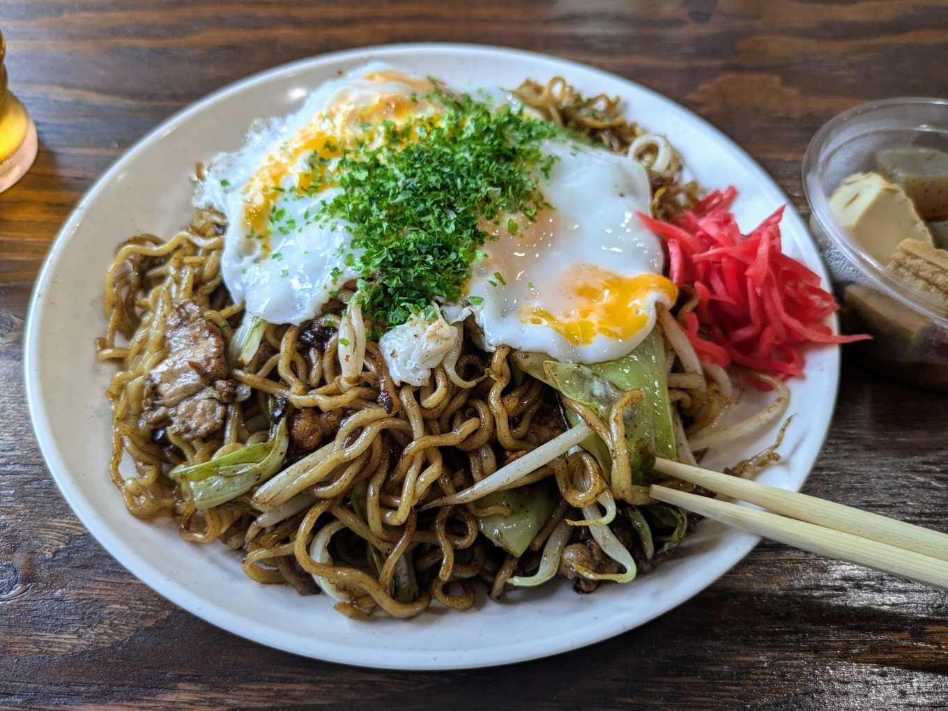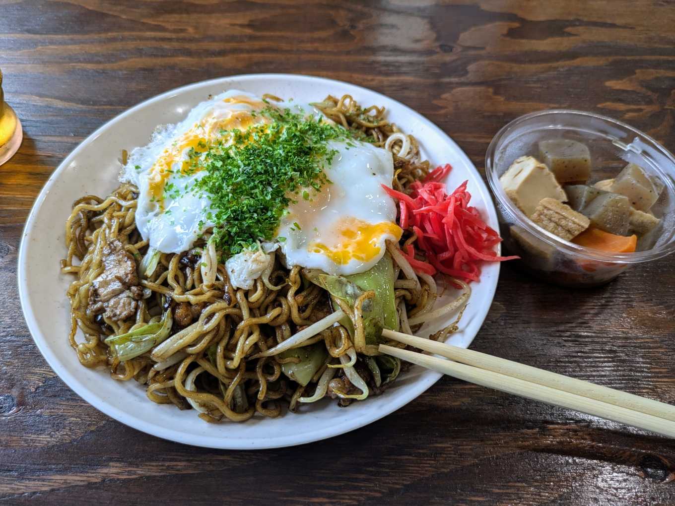麺が香ばしく焼かれていて、これぞ焼きそばという味わいでした。お肉もいっぱい!いただいた煮物も美味しかったです。ごちそうさまでした。