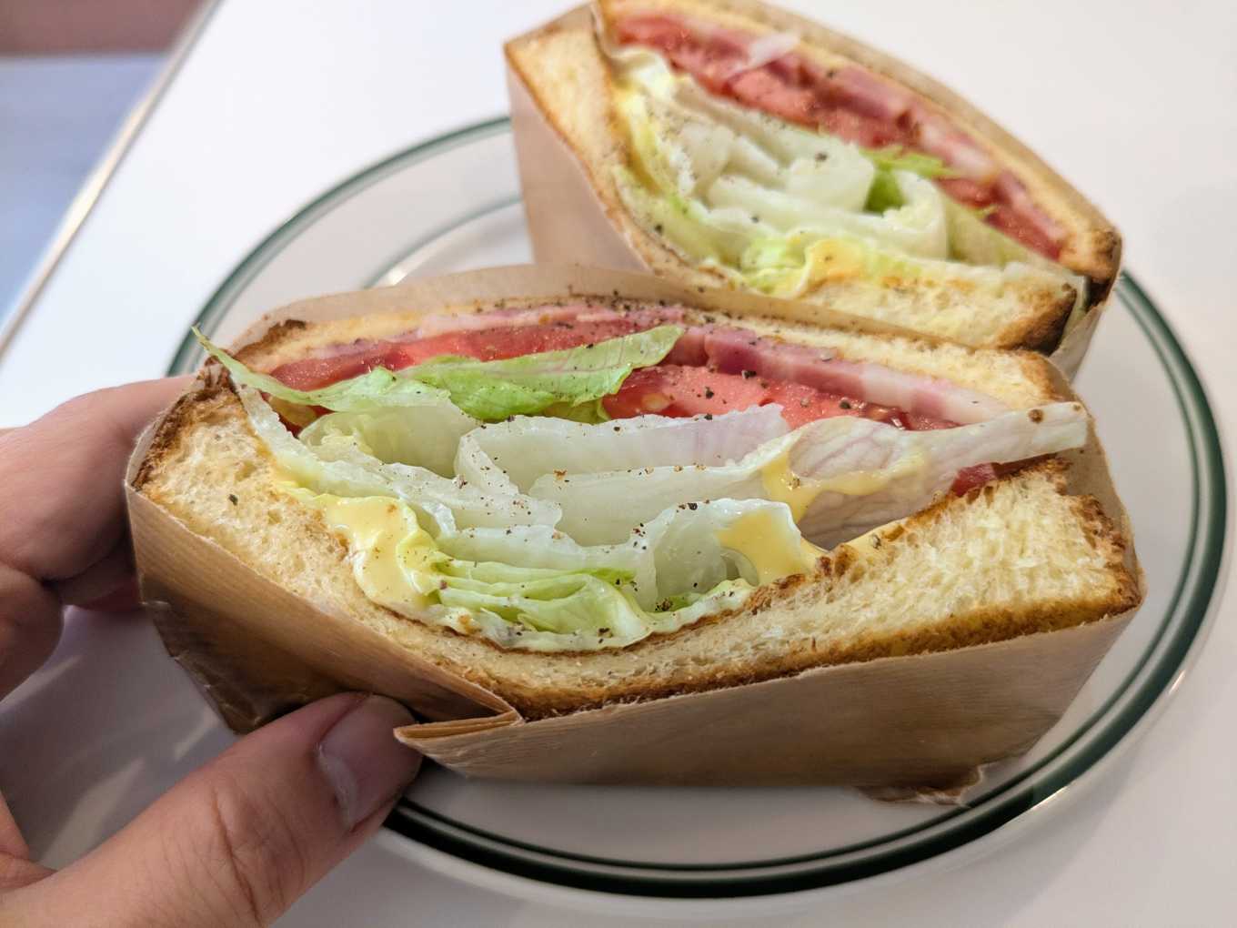 パンがとても軽いです。軽いといってもスカスカという意味ではなく、さっくりした食感で、少し甘みがあって、とても食べやすく美味しいです。具とのバランスもとてもいいですね。