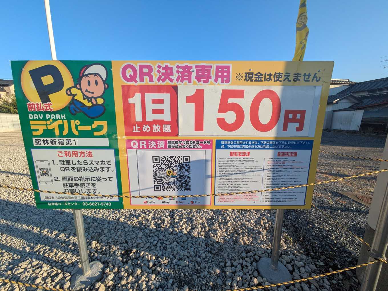 駐車場名は「デイパーク 館林新宿第1」です。システムは1日単位、前払式です。QRコード決済専用で現金が使えません。ご注意ください。
