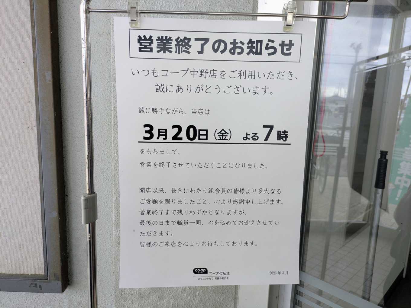 3月20日(金)をもちましてコープ中野店は閉店いたします。永い間ご利用いただきましてありがとうございました|コープぐんま