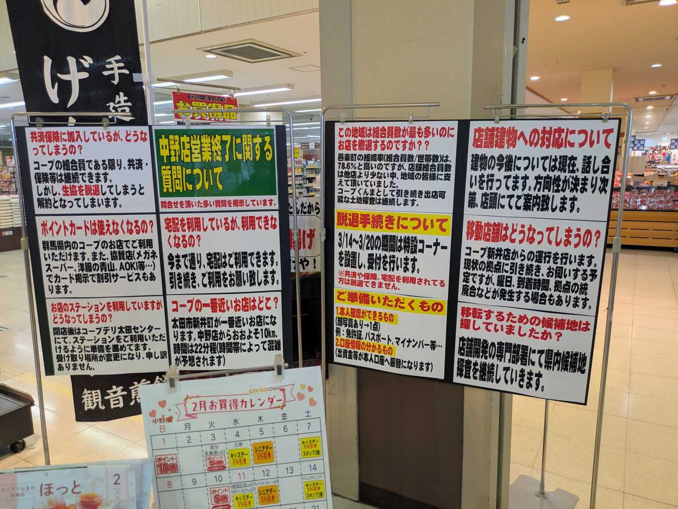 店内には、営業終了に際しての疑問点などへの回答が掲示してありました。組合員を脱退する方は、3月14日から20日まで特設コーナーが設置されるそうです。