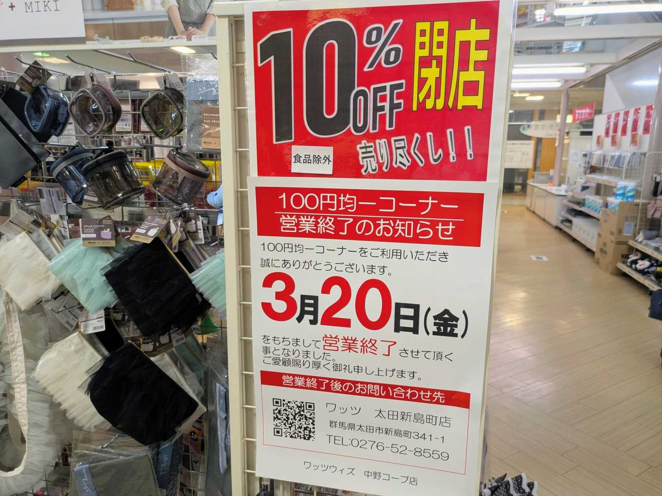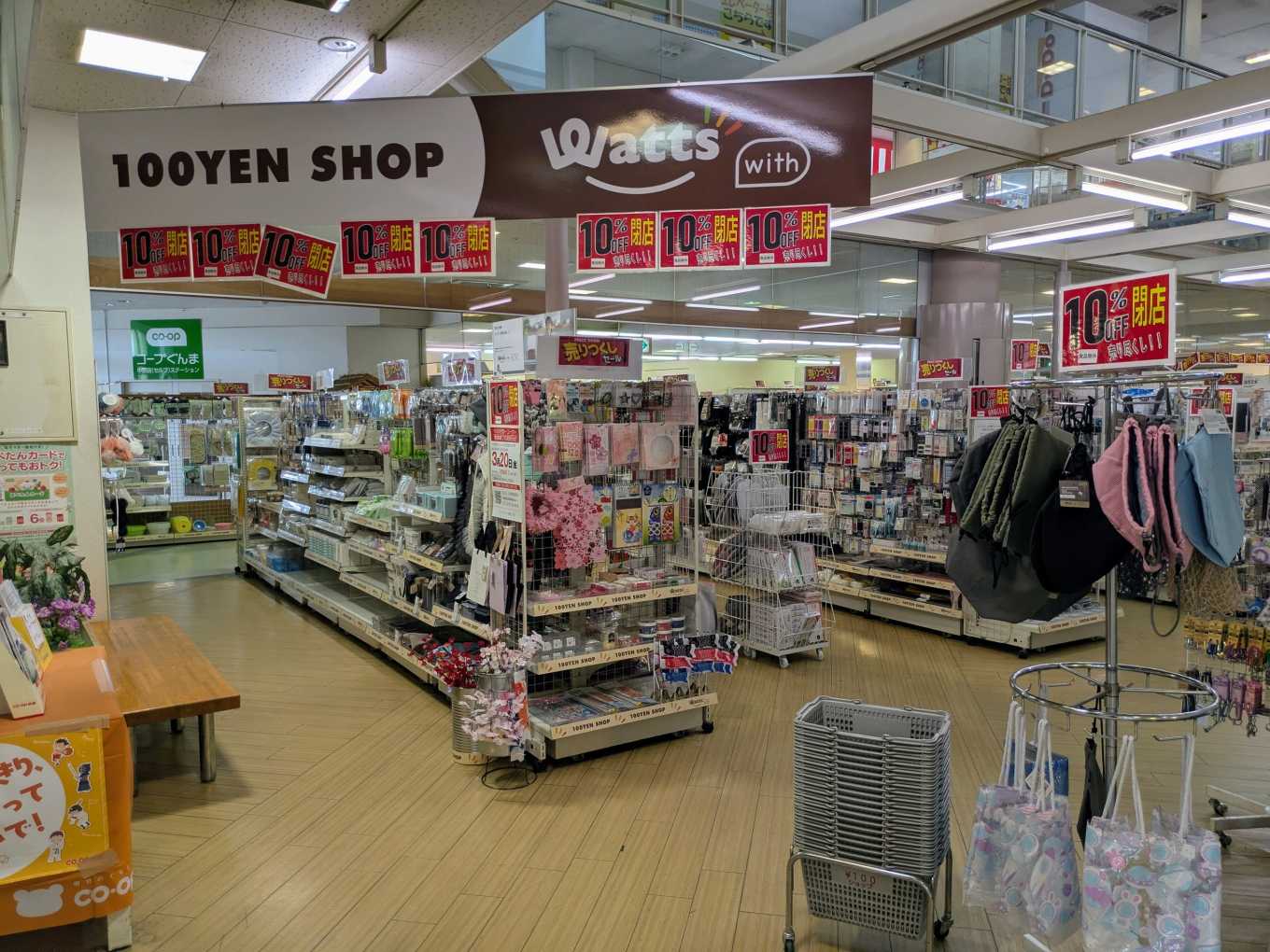 ワッツも3月20日に合わせて閉店となります。10%OFF閉店売りつくしセール(食品は除く)を実施しています。