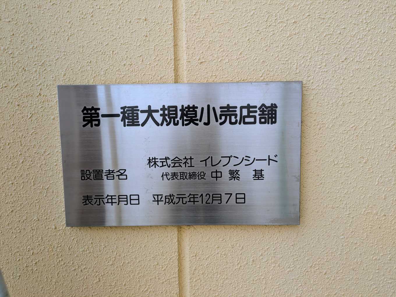 建物に第一種大規模小売店舗の看板がありました。これを見ると、表示年月日は平成元年(1989年)12月7日とあります。ほぼ昭和、ギリ平成で、今年で築37年ということになります。