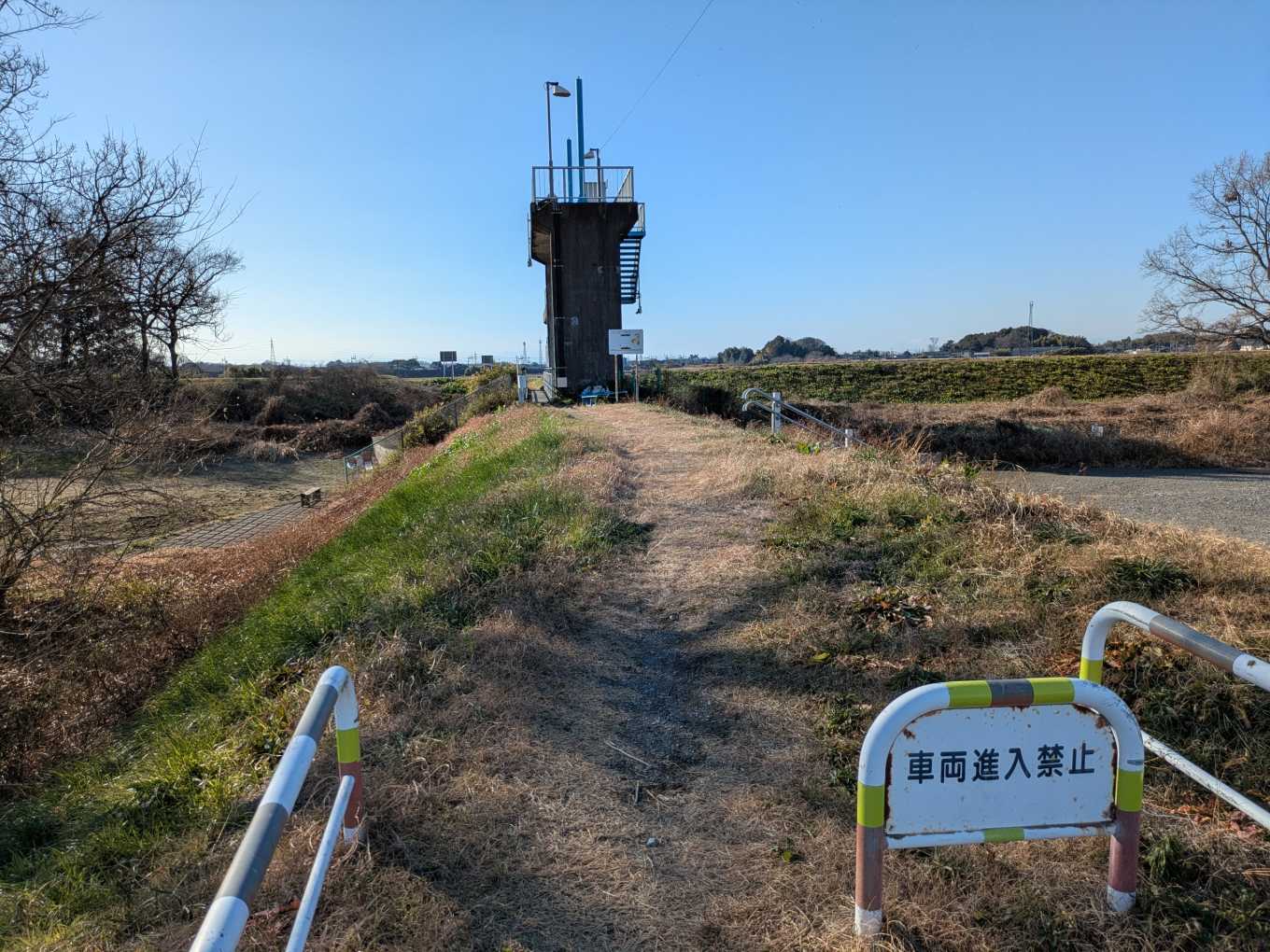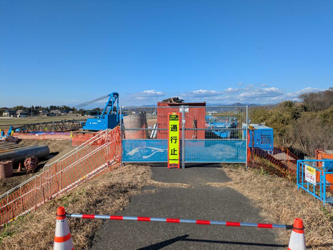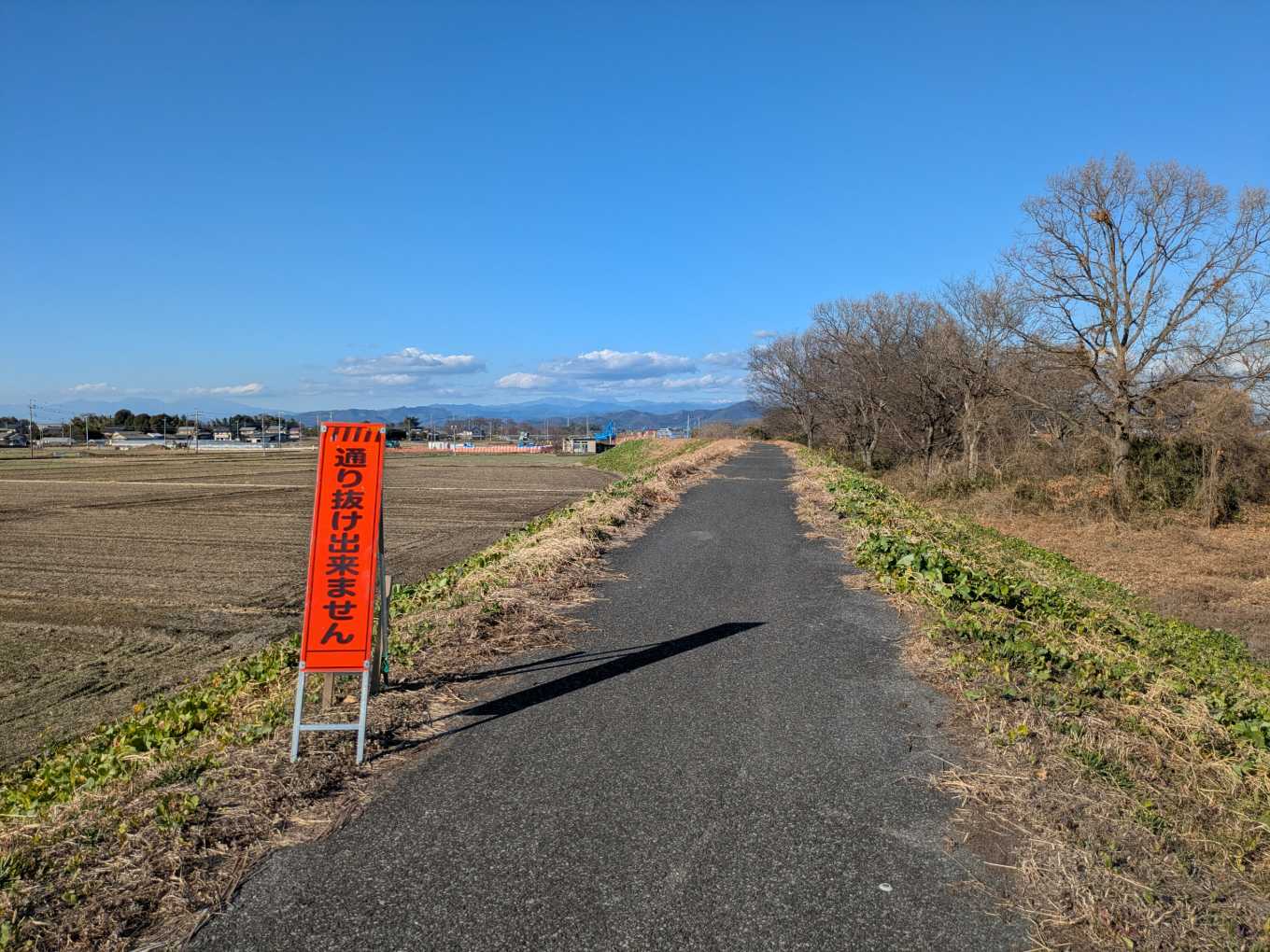 右岸の堤防北方向を見たところ。「通り抜け出来ません」いぜんはこんな立て看板はありませんでした。気になるので行ってみます。