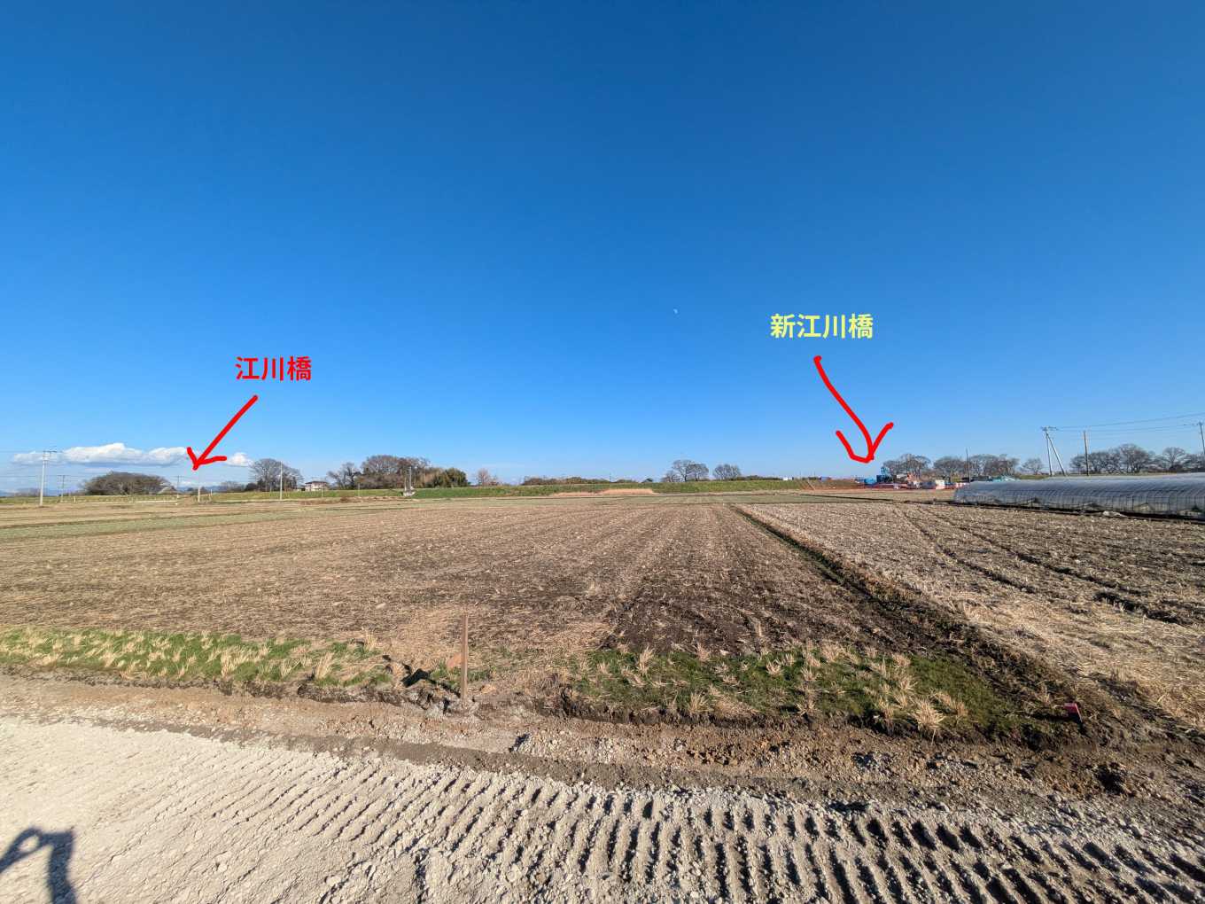 このあたりから見た、新旧江川橋。こんな位置関係です。