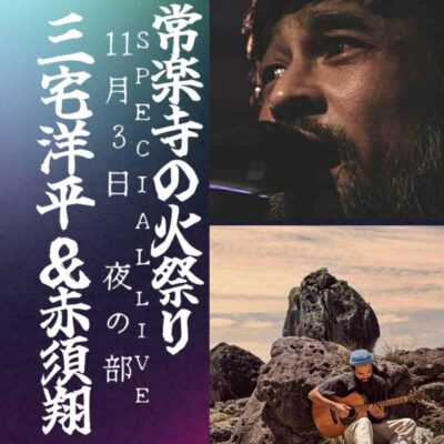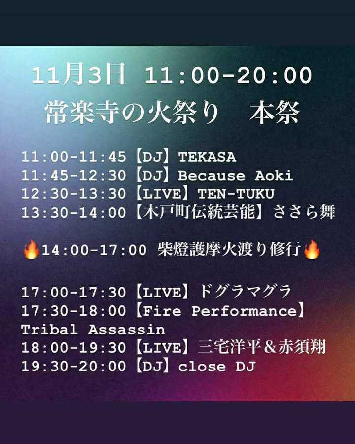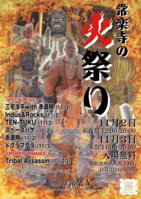柴燈護摩火渡り修行、音楽・DJライブ、境内マルシェが楽しめるお祭りです。