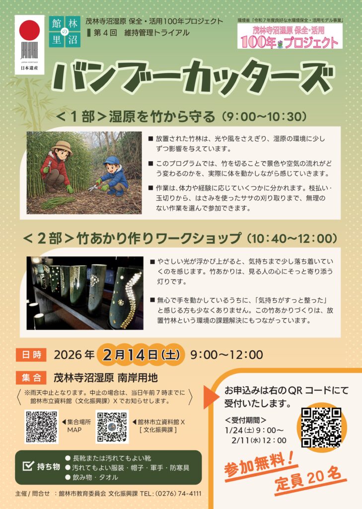 環境省の「令和7年度良好な水環境保全・活用モデル事業」に採択された館林市の「茂林寺沼湿原保全・活用100年プロジェクト」の取組のひとつ、「地域活動者による維持管理トライアル」の第4回目「バンブーカッターズ」を2月14日㈯ 9:00~12:00に茂林寺沼湿原で開催します。