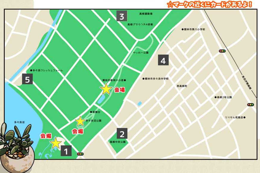 ①松沼南駐車場(障害者の方優先)・②高根中央公園駐車場・③高根グラウンド駐車場周辺・④旧館林高等技術専門学校跡(高根公民館前)・⑤多々良農村公園