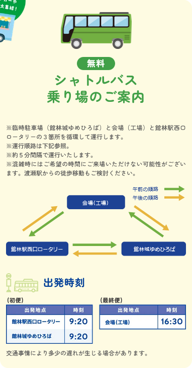 臨時駐車場の館林城ゆめひろばと会場(工場)と館林駅西口ローターリーを循環運転するシャトルバスが運行されます。
