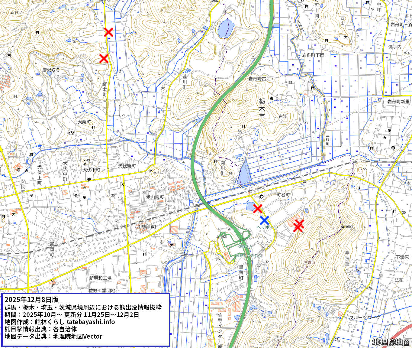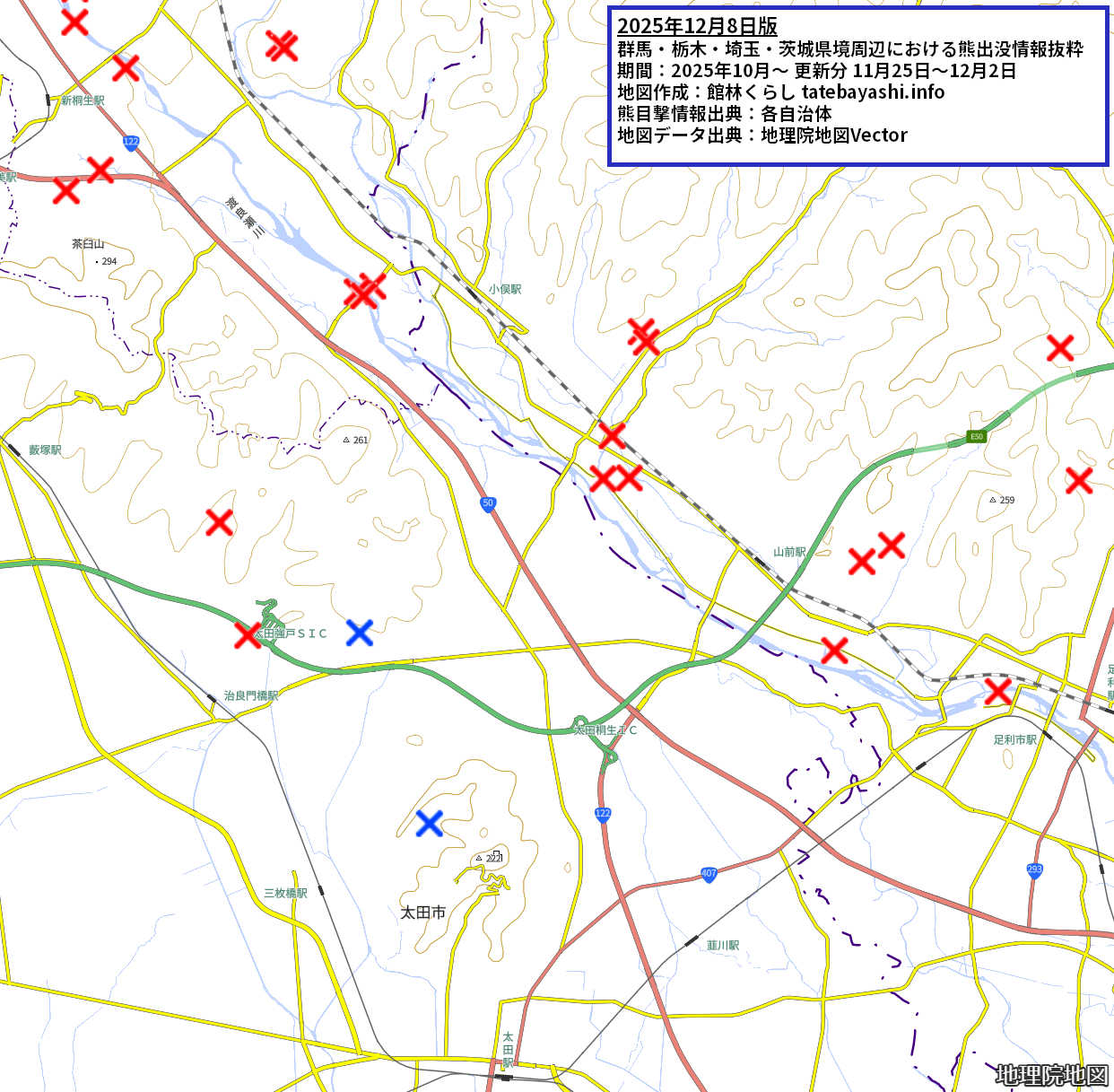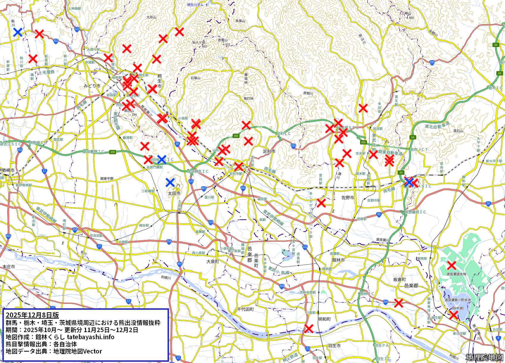 群馬・栃木・埼玉・茨城県境周辺の熊出没情報 2025年11月25日版【桐生足利佐野他】