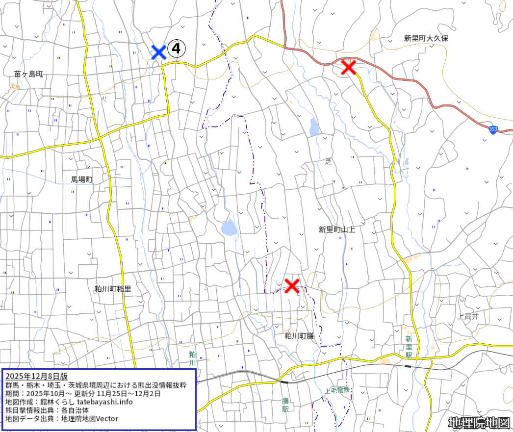 群馬・栃木・埼玉・茨城県境周辺の熊出没地図 2025年12月8日版
