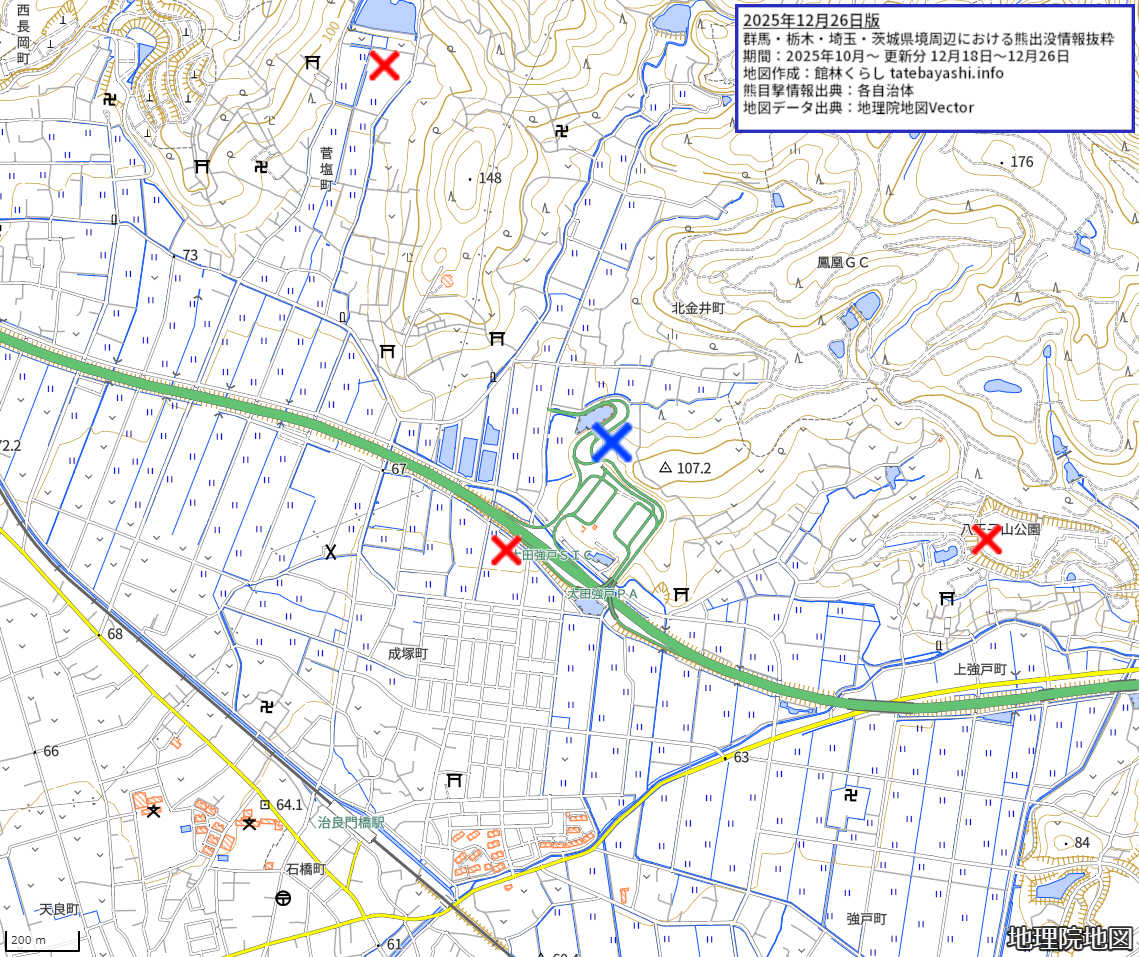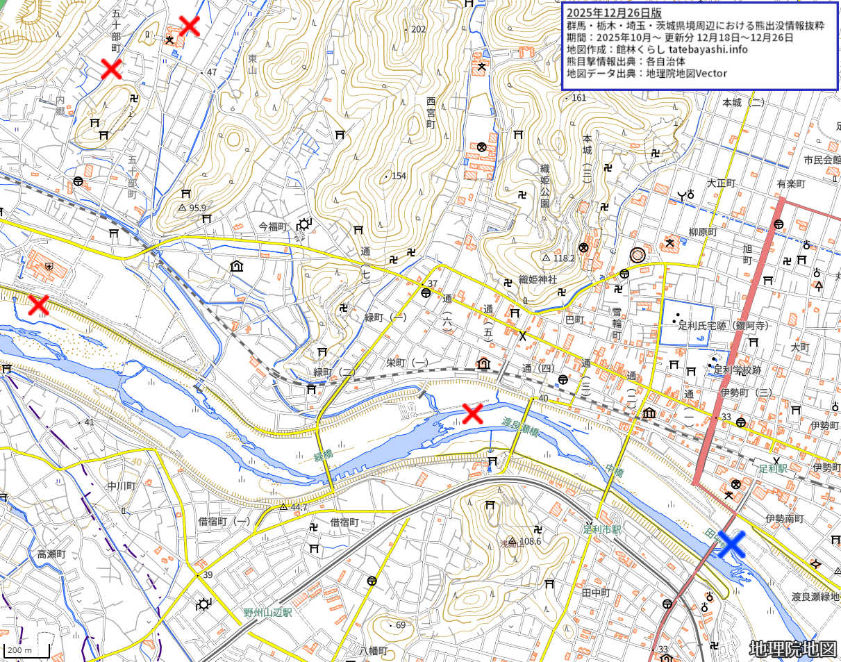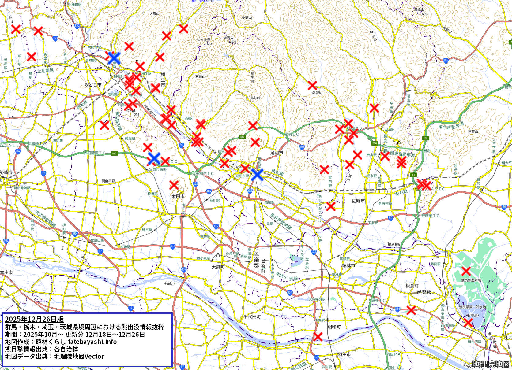 群馬・栃木・埼玉・茨城県境周辺の熊出没地図 2025年12月26日版 全体地図