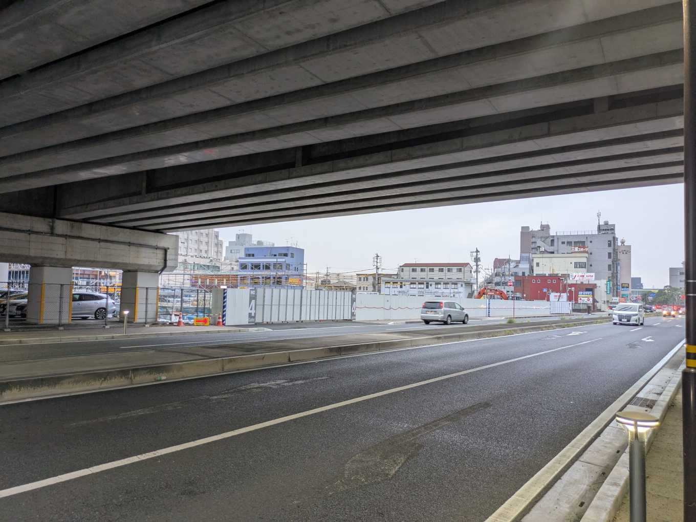 国道407号沿い、鉄道高架下から見たところ。もう建物がなくなっています。