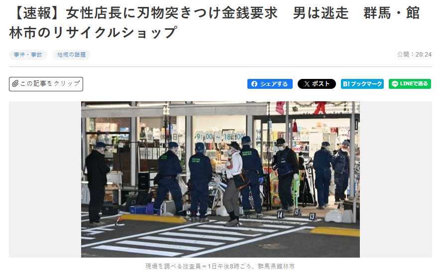 上毛新聞の速報記事 ⇒ 【速報】女性店長に刃物突きつけ金銭要求 男は逃走 群馬・館林市のリサイクルショップ