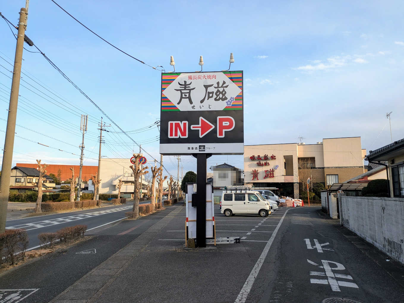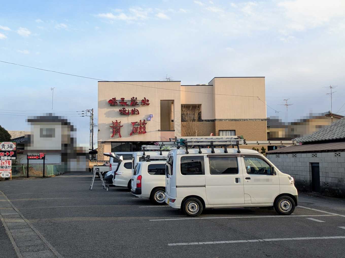 『青磁 館林本店』です。駐車場に工事の車両がとまっています。そして、看板が新しいものに変更されていました。
